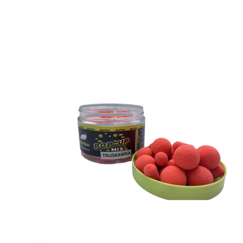 Truskawka Kulki Proteinowe Pop-Up Mix 12-20mm RaFish – pływające kulki proteinowe o intensywnym truskawkowym aromacie, idealne do method feeder, zestawów karpiowych różnego rodzaju. Mix rozmiarów (12-20mm) zapewnia wszechstronność w różnych warunkach. Świetna wyporność i długotrwałe uwalnianie zapachu skutecznie wabią ryby. Must-have na każdej zasiadce!